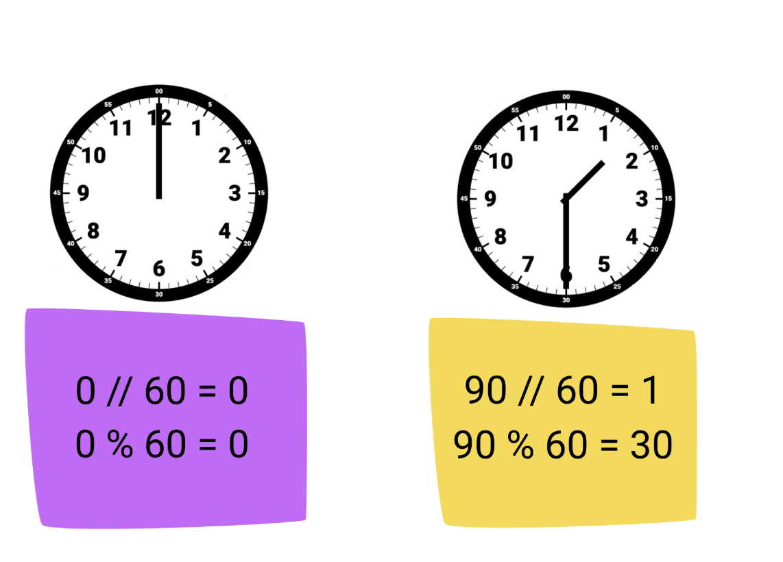 Here, the hour hand represents floor division between the minutes elapsed and 60. The minute hand tells us the modulus, or remainder, of that division. After 90 minutes, for example, the time is 1:30 – one hour with 30 minutes remaining.
