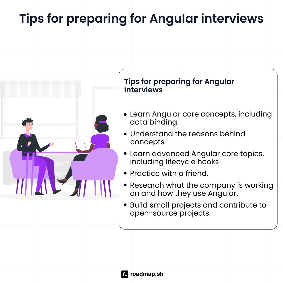In this guide, I'll cover the most common Angular interview questions and answers, organized by experience level, to help you get ready. I'll cover the basics, such as standalone components, as well as more advanced topics like state management. You can also check out the interactive flashcards to help you practice and learn better. If you want to get started with learning Angular, take a look at the Angular roadmap.