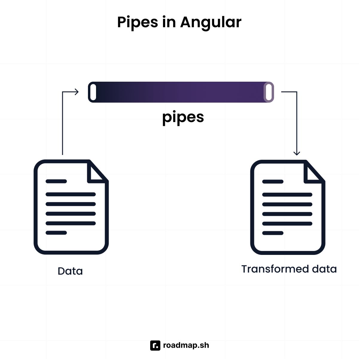 Angular provides built-in pipes like date, uppercase, currency, and json. You can also create custom pipes for any logic that the built-in pipes don’t cover. The syntax for Angular pipes is very simple. You use the pipe operator (the vertical bar |) inside your interpolation braces: