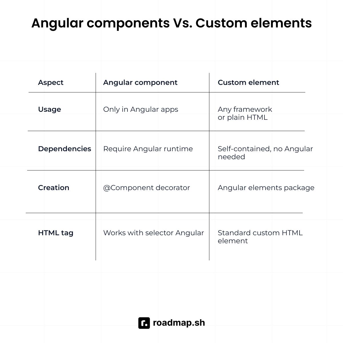On the other hand, custom elements are framework-independent web components that conform to web standards. They work with any JavaScript framework or in a vanilla JavaScript environment. Angular can convert a component into a custom element using Angular elements. It creates a standalone component with an associated custom element tag that you can use anywhere.