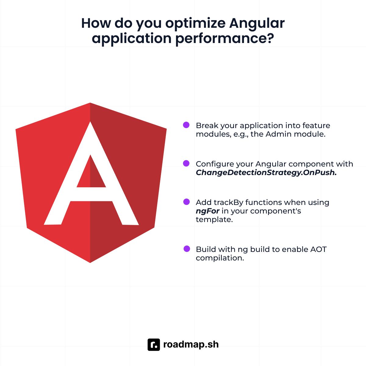 Interviewers, for example, won't only ask you a simple "what is an Angular component?" question. Instead, they will ask you to explain how to structure Angular components across large applications. You'll discuss when OnPush a change detection strategy makes sense and how to avoid memory leaks. Expect questions about RxJS operators, routing guards, lazy loading, and performance debugging.