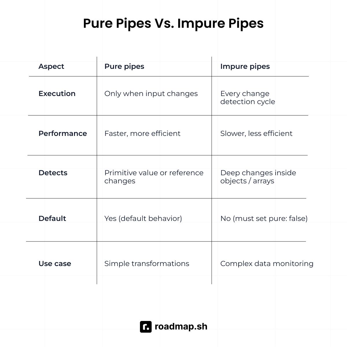 ![import { Component } from '@angular/core'; import { switchMap, mergeMap, concatMap } from 'rxjs/operators'; import { fromEvent, of } from 'rxjs'; @Component({ selector: 'app-operators', template: `<input #searchBox>` }) export class OperatorsComponent { // switchMap - cancels previous, only latest matters searchWithSwitch() { fromEvent(this.searchBox.nativeElement, 'input').pipe( switchMap(() => this.http.get('/api/search')) ).subscribe(results => console.log(results)); // Types "abc" fast → only "c" search completes, "a" and "b" cancelled } // mergeMap - all run in parallel, no cancellation saveMultipleWithMerge() { const items = [1, 2, 3]; of(...items).pipe( mergeMap(item => this.http.post('/api/save', item)) ).subscribe(result => console.log(result)); // All 3 POST requests run at same time } // concatMap - waits for each to finish, maintains order processQueueWithConcat() { const tasks = [1, 2, 3]; of(...tasks).pipe( concatMap(task => this.http.post('/api/process', task)) ).subscribe(result => console.log(result)); // Task 2 waits for task 1, task 3 waits for task 2 } }](https://assets.roadmap.sh/guest/angular-advanced-interview-questions-9z1ry.jpeg)