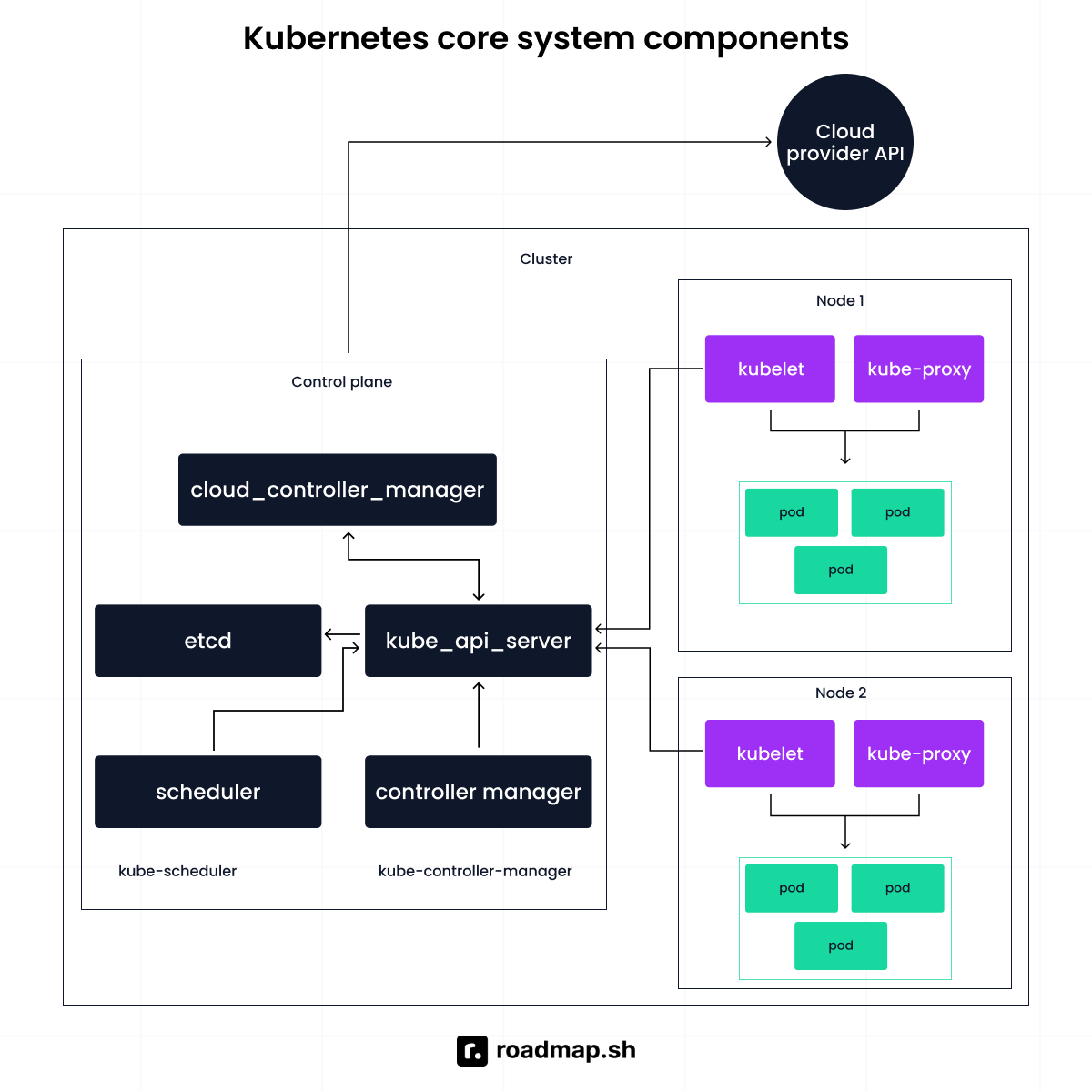 The Kubernetes control plane is the brain of the cluster. It runs as a group of control plane components, including the API server, scheduler, and controller manager. In production clusters, these components run across multiple nodes to improve reliability and avoid a single point of failure. Everything flows through the control plane, which is why understanding Kubernetes architecture starts here.
