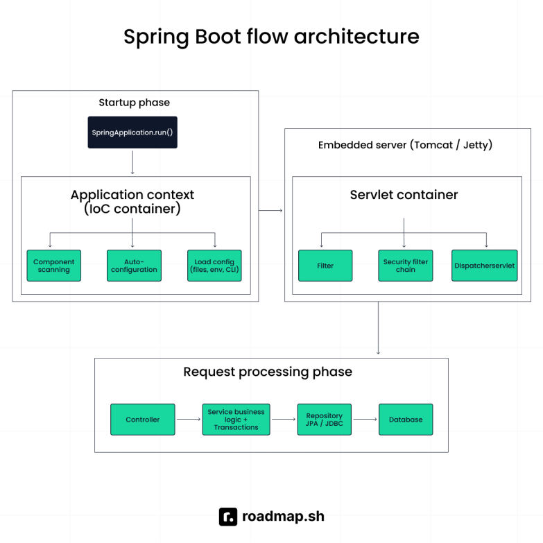 The Spring Boot flow architecture encapsulates how a request moves through a Spring Boot application from entry point to response generation.