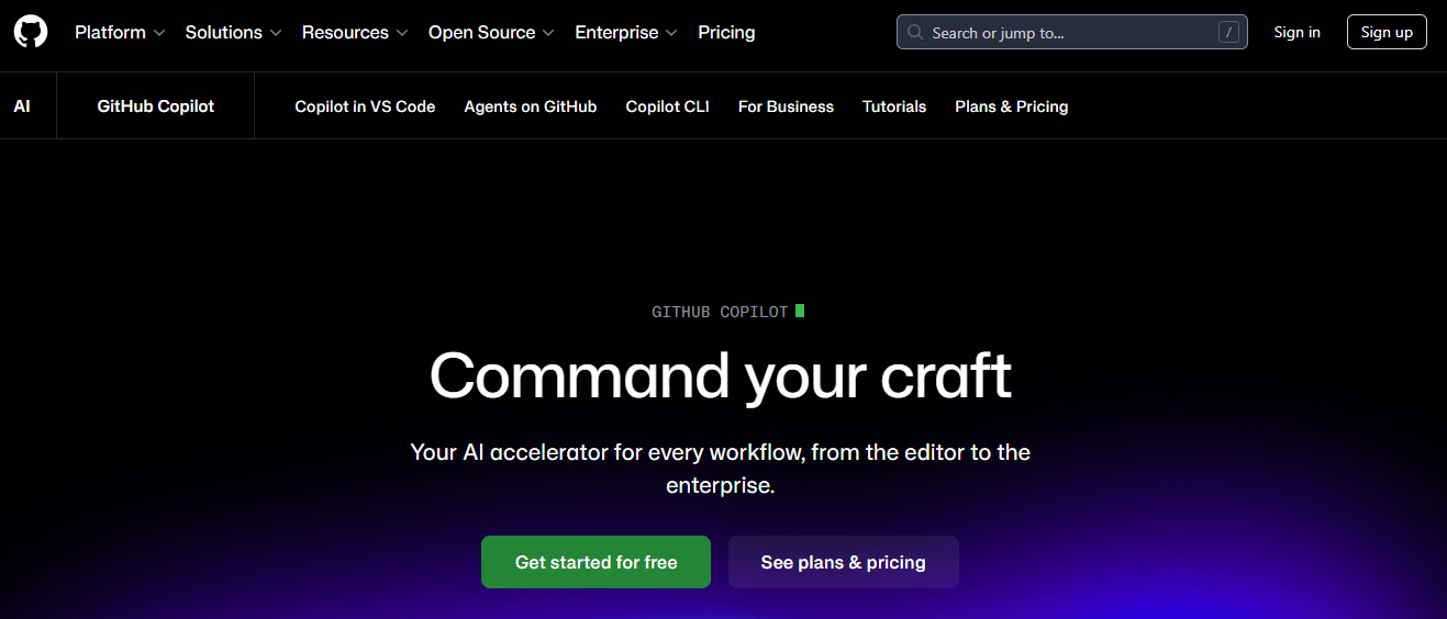 GitHub Copilot makes this list because it integrates with more editors and IDEs than any other tool in this guide. It’s best for developers and engineering teams already using GitHub. It fits into that same platform from day one, so they get AI coding support without adding a new tool to their setup. Also, it serves students and open-source maintainers who can access the tool for free.