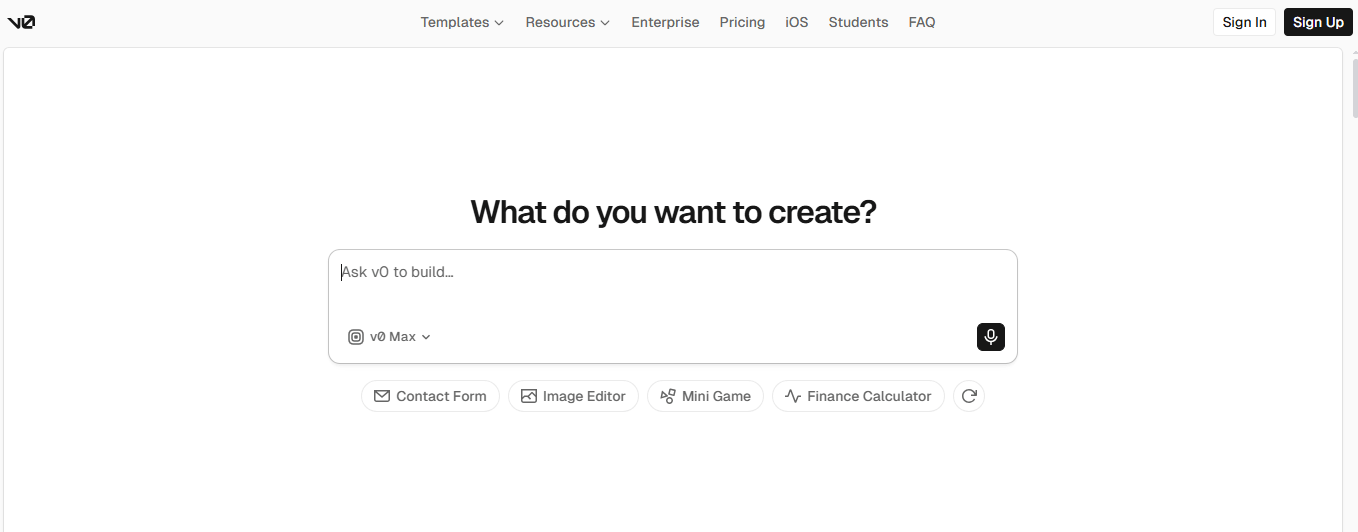 v0 by Vercel is an AI-powered UI builder built by Vercel, the team behind Next.js, and launched in 2023. You access it from any browser with no local setup or installation needed. It runs on Vercel's own AI models (v0-1.5-md, v0-1.5-lg, and v0-1.0-md) and connects to your GitHub repo and Vercel environment. v0 generates actual code directly in your project, rather than in a separate sandbox environment.
